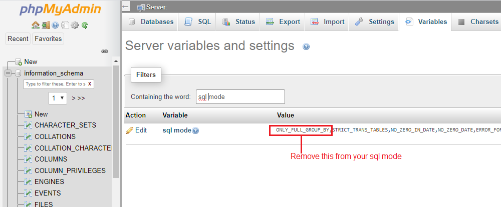Open phpMyadmin of your server then go to Variables tab then edit sql mode variable value and remove ONLY_FULL_GROUP_BY.